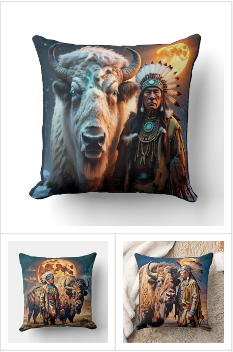 These stunning designs capture a powerful and symbolic moment, featuring a Native American chief standing proudly next to a majestic bison under the glow of a radiant full moon.