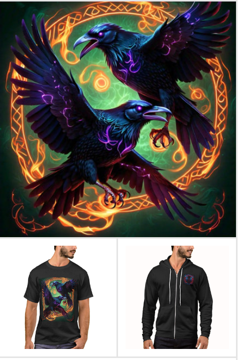 Mystic Ravens” design! Featuring two majestic ravens with luminous purple and blue accents, surrounded by glowing Celtic-inspired runes and fiery orange energy, this artwork captures the perfect blend of mystery, elegance, and boldness. Whether you’re a fan of Norse mythology, love gothic aesthetics, or simply appreciate unique, eye-catching art, this design is sure to turn heads. Available on high-quality t-shirts, cozy sweatshirts, art prints, greeting cards, and more, this design is perfect for anyone looking to add a touch of mysticism and magic to their wardrobe or home decor. It also makes a fantastic gift for lovers of the arcane, fantasy enthusiasts, or those who embrace the mysterious beauty of ravens.